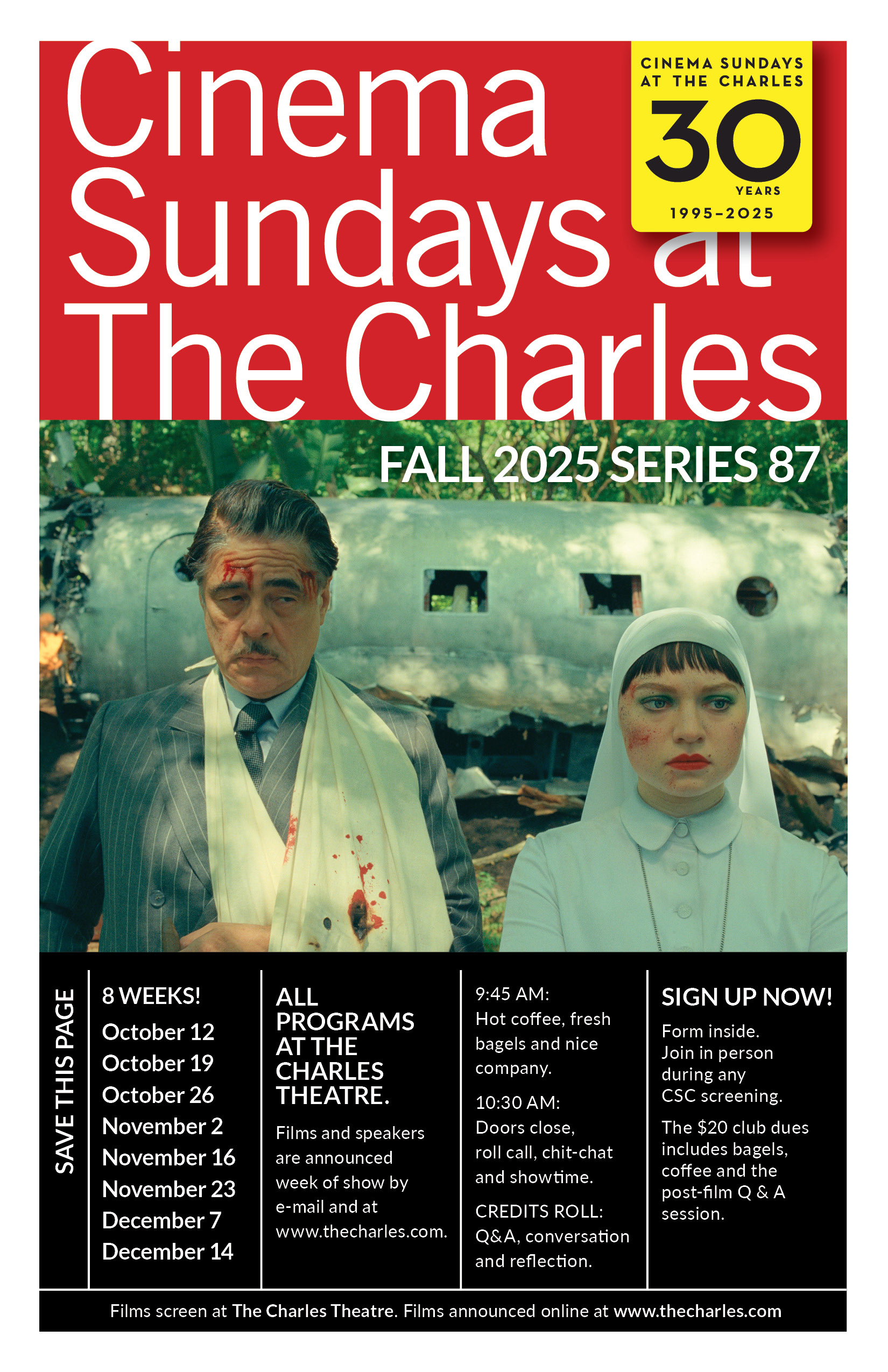 Cinema Sundays Club at The Charles includes a weekly movie screening.  In addition to the film, members enjoy bagels, coffee, coupons to local businesses and post-film discussions with guest speakers.